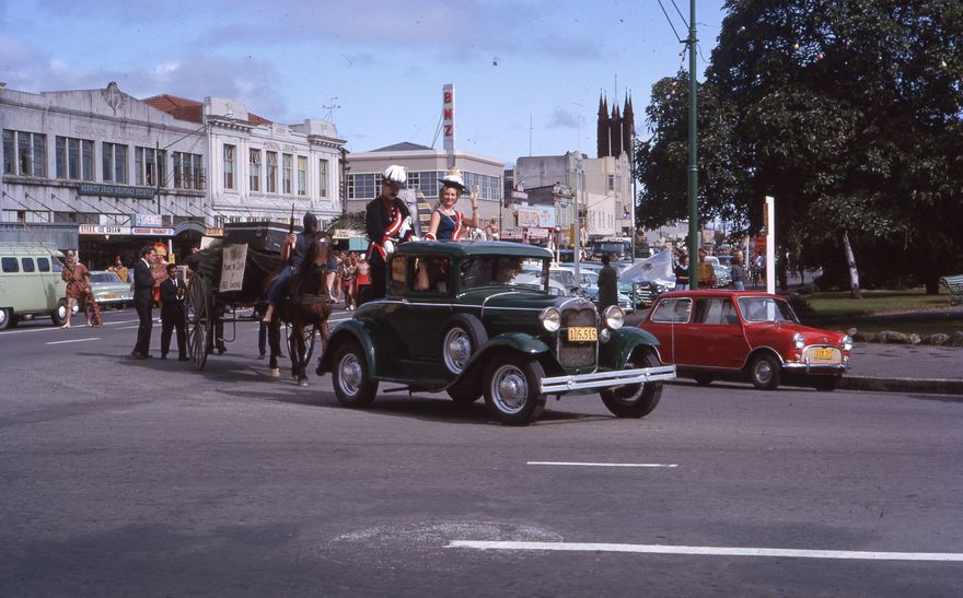 The annual Student procession or 'Procesh' was held at midday on the Monday of 'Capping Week' and was a highlight of 'Town and Gown' relations between Massey University and the City. Sometimes courting controversy with its 'student humour', the parade usually consisted of floats, clowns and trick cyclists. It attracted large crowds, stopping traffic along Broadway and around the Square and usually ended with a ceremonial ducking in the Butterfly pond after speeches by students representing 'Lord and Lady Massey' and the Mayor.