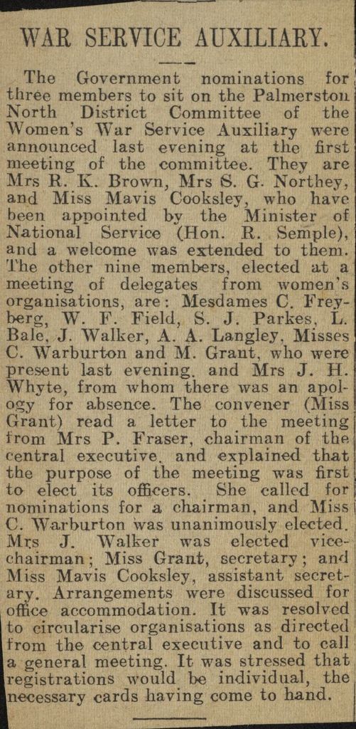 Newspaper article of the first meeting of the Palmerston North District Committee of the Women's War Service Auxiliary.