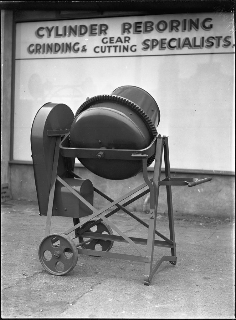 Concrete mixer built by A F Martin Ltd of 648-660 Main Street (at the time of the photograph). Martins were engineers, grinders and gear cutters. They also erected and repaired machinery, made concrete posts and manufactured 'Martins Concrete Mixers' and woodworking machinery (Wises Directory 1953).