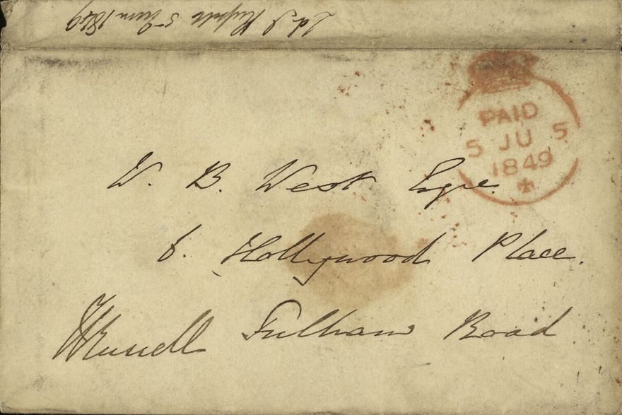 Envelope addressed in the handwriting of Lord John Russell, to W B West Esquire, 6 Hollywood Place, Fulham Road. Russell has signed the envelope, date stamped 5 June 1849, at the bottom of the address and on the back. Also back of the envelope shows the seal of Lord John Russell and date stamp. Lord John Russell was the Secretary of State for Foreign Affairs when Lord Palmerston was Prime Minister of the United Kingdom. This record is part of a collection relating to Lord Palmerston (1784-1865), after whom Palmerston North was named. The donor of the Lord Palmerston collection, F C Holland of England (who was interested in philately and postal history) donated items relating to Lord Palmerton during the 1970s, after visiting Palmerston North.