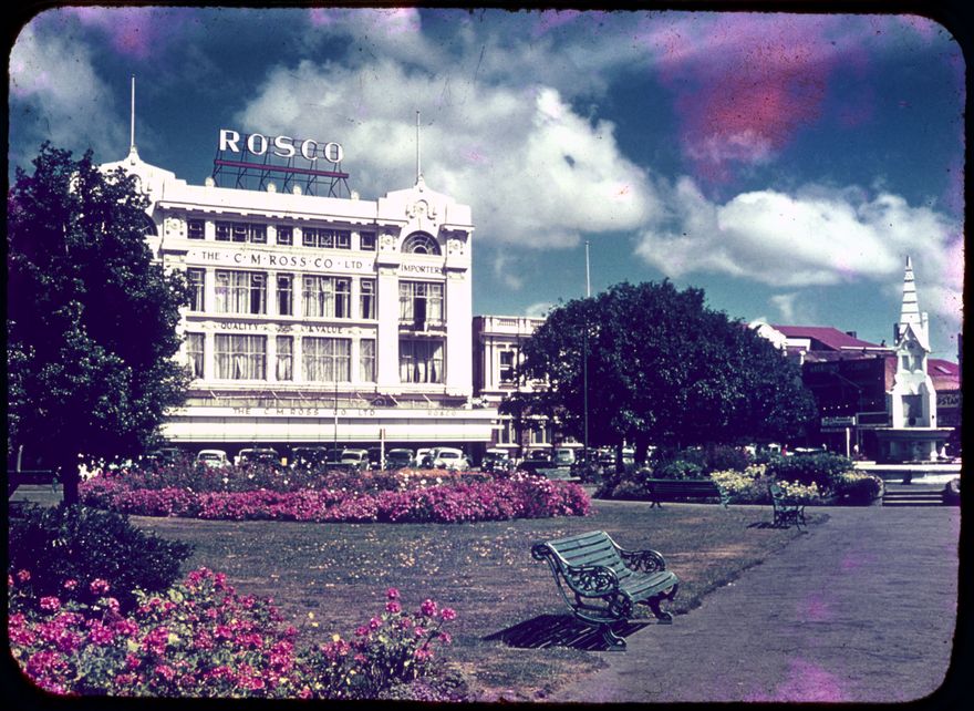 A sunny day in the Square is captured in this 1960s slide. The prominent building is the C M Ross Co Ltd building - now the City Library [2016].