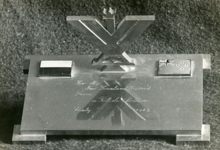 This letter weight, made of aluminium, bears a stylized Polish eagle and the Polish and New Zealand national flags. The slab base is inscribed, "To my New Zealand friend from a Polish soldier, Italy, 1945", and on the other side "Captain E Lachwski". It was one of the gifts made by Polish soldiers to give to New Zealand as an expression of their heartfelt gratitude for New Zealand's treatment of the Polish children refugees and appreciation of the great friendship shown to the soldiers through the sending of correspondence and parcels, during World War Two. This item is held by Te Manawa, Palmertson North.
