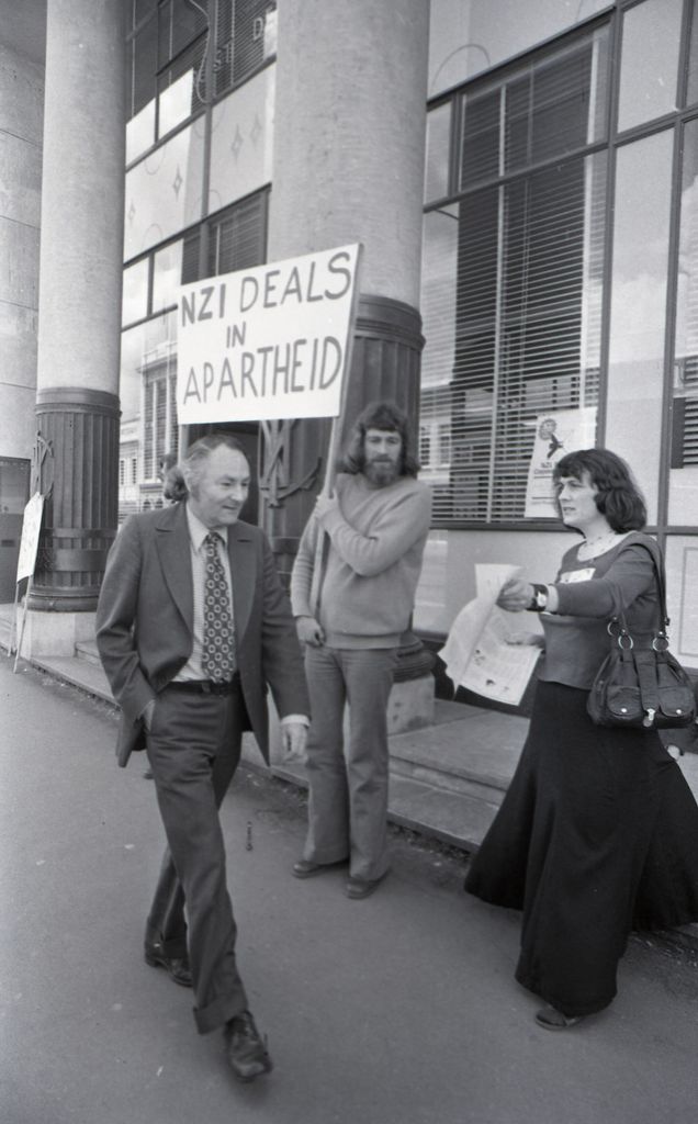 Anti-apartheid demonstrators outside the NZI (NZ Insurance) building in Palmerston North. The protester standing in front of the column is Cyril Francis "Red" Parsons (1942-1982), a school teacher and Massey University lecturer who was active as a community organiser.