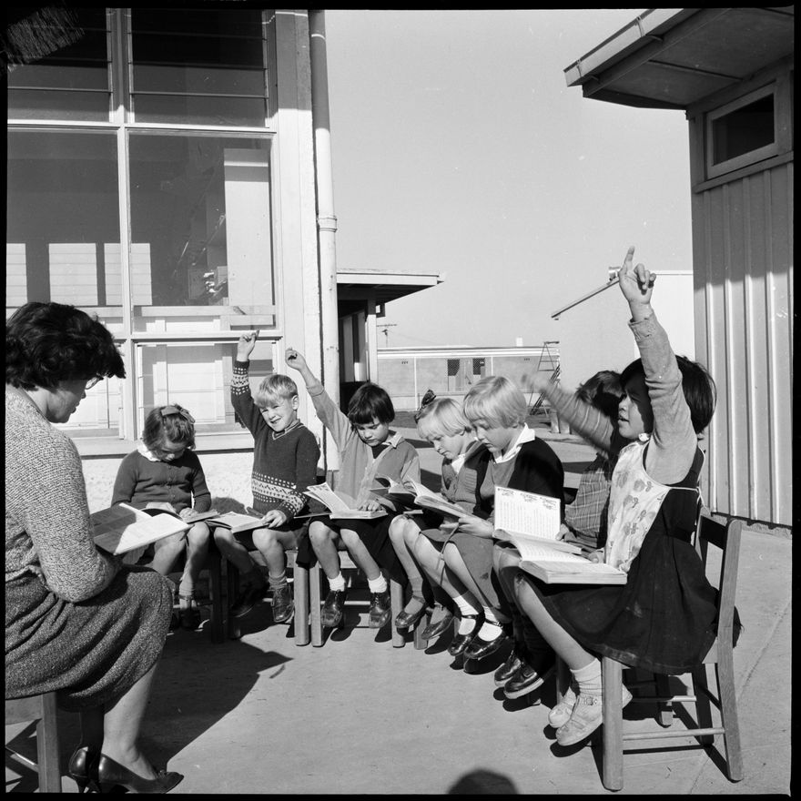 This image was taken for a story that ran in The Manawatu Evening Standard on 8 May, 1963. "This primer four class the Takaro School are enjoying their reading lesson in the sun with their teacher, Mrs B. Paulin. Four have already found the answer and are eager to be chosen. In the group (from the left) are J. Thomson, C. Turner, V. Atkinson, C. Stewart, S. Herbert, W. Johnson and C. Hara."