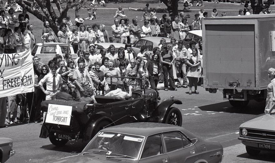 This image was taken (but not used) for a story that ran in The Manawatu Evening Standard on Wednesday 22 November 1978 “Angry Crowd gives P.M. a rough ride: Election fervour hit Palmerston North at lunch time today when the Prime Minister Mr Muldoon took part in a parade around the central city. The parade never reached the heights of some of the Ranfurly Shield parades the city has seen, but the ‘Blues’ can take some credit for bringing a carnival air to a quiet election campaign. Two lone placard bearers saw the party of supporters and local candidates off at the corner of Church and Pitt streets, but further along the journey the Prime Minister’s entourage was faced with New Zealand citizens in ‘mourning’. Boos and jeers met the parade as the corner of the Square and Broadway and something was thrown into the vintage car carrying Mr Muldoon. Otherwise the parade was uneventful”