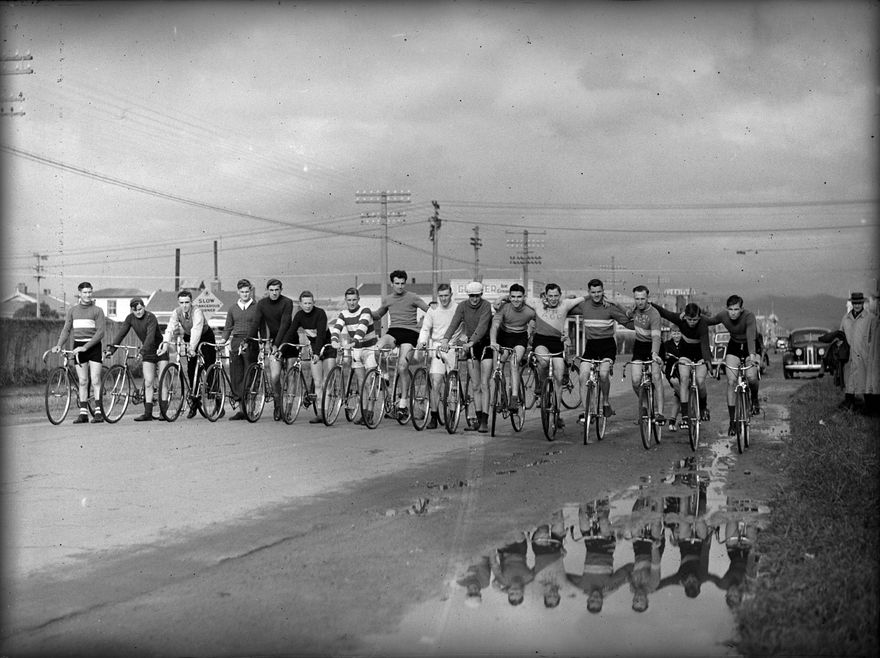 This photograph shows the competitors in a regular bicycle race in Palmerston North in which the competitors raced to Bulls and back. The starting line was outside the old Family Hotel on the corner of Rangitikei and Featherston Streets. From right: Mick Moberly, Murray Smith, George Perigo, Hek Graham, Graham Barnes, Bert McGarry, Tom Imrie, Don Yates, Monty Hollows, Jim Thomson, Mike Duffield, Rod Sandilands, Ian Campbell, Murray Carkeek, Johnnie Jenkins.