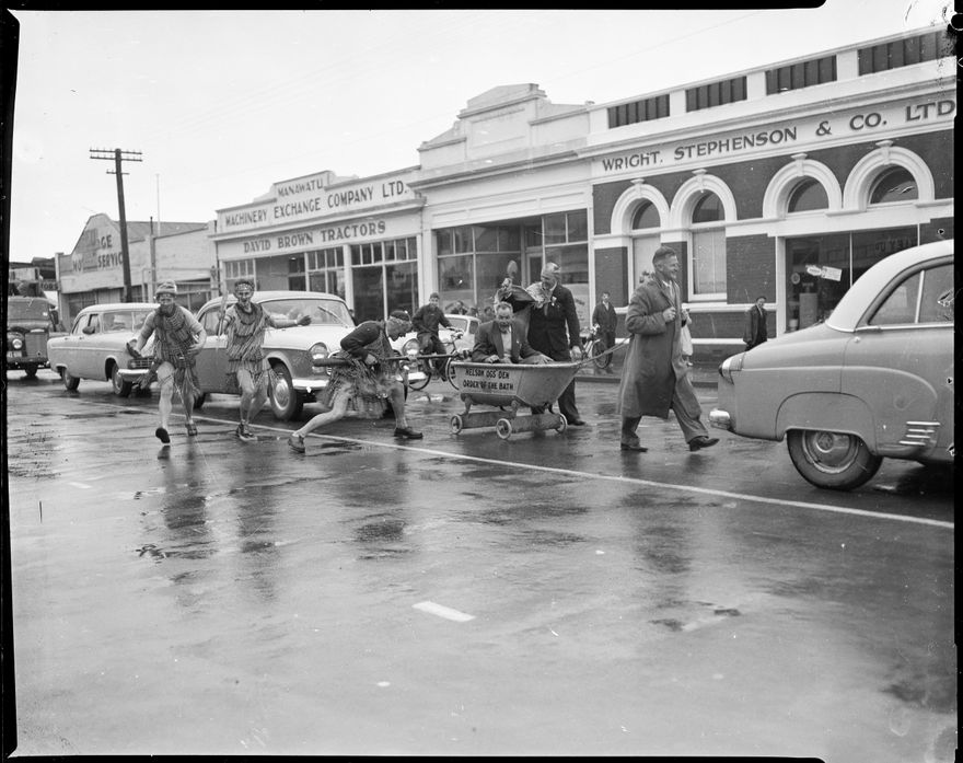 This image was taken for a story that ran in The Manawatu Evening Standard on 25 August 1958, page 9: "A portion of the street "procession" by members of the Manawatu Savage Club when they were hosts for a "raid" by the Hawera Savage Club on Saturday."