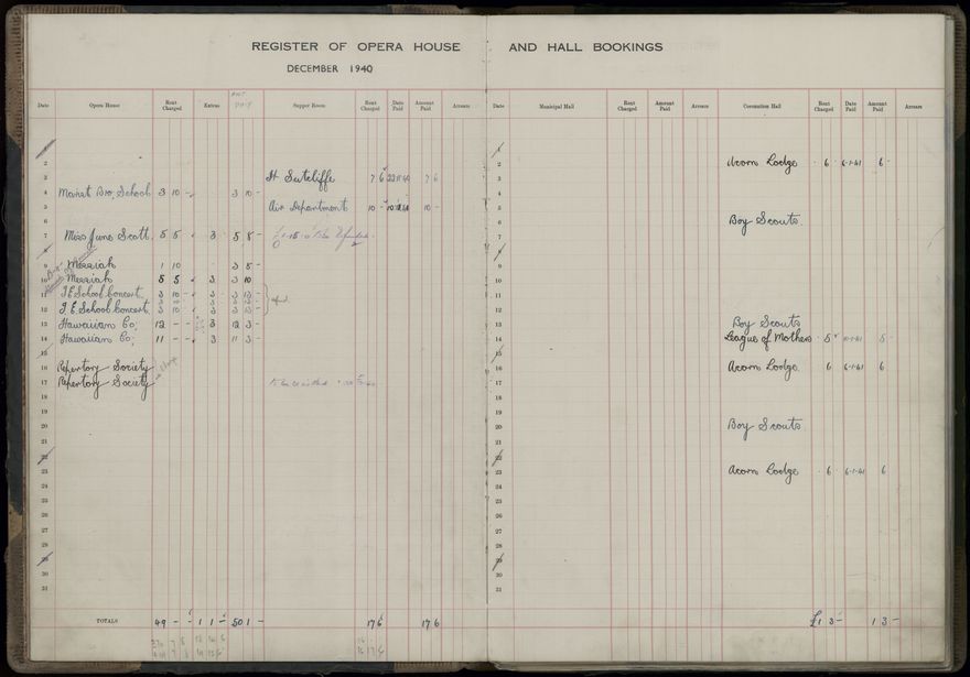 This register for the Palmerston North Municipal Opera House and Coronation Hall records bookings from 1940 until 1945, for performances, meetings and the activities of community groups. During the Second World War, these venues were also used to support the war effort, including by the Women's Auxilary services, the Home Guard and for Soldier Send Off events. The Opera House hosted performances by the Kiwi Concert Party and the Young Māori Club. This building, designed by F J Wilson and built by J Trevor and Sons, was erected on Church Street in 1904-1905 and opened 12 July 1905. In 1952 the Opera House was condemned as unsafe by the Palmerston North City Council and was strengthened and remodelled both inside and out in 1955. It was sold by the PNCC to a businessman in 1996 and demolished. The Coronation Hall, located at 801 Main Street, was built as a Public Hall in 1911 to mark the Coronation of George V. In 1962 it was bought by the Palmerston North Little Theatre Society (later Manawatu Theatre Society) and became a playhouse. In 1996 the hall was bought by Douglas and Moana Hann, who renovated the building into a home. As of 2014, it is the premises of a painting and decoration business.