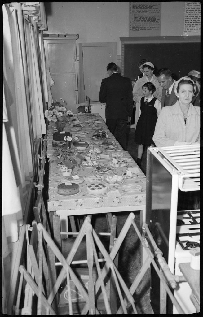 This image was not published in The Manawatu Evening Standard, taken on 13 August, 1959. "Unidentified Students and Parents at an unidentified school inspecting a table full of baked goods."