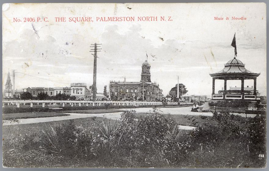 - This postcard of the Band Rotunda in The Square was possibly taken to mark the opening of the Post Office (corner of Main Street East and The Square). Note the flags and crowds of people. The Band Rotunda featured here was the first of two built in The Square. Constructed in 1899, this incarnation was shifted to the Victoria Esplanade in 1907. A second larger band rotunda was then built. It was demolished in 1956 to make way for the Hopwood Clock Tower. The structure on the left is the Coronation Monument. It was built in 1904 to mark the coronation of King Edward VII. It has been moved several times - once to the corner of the Square near the City Library to make way for the War Memorial (built 1925) and again in 2005 to the corner of the Square near Broadway Avenue.