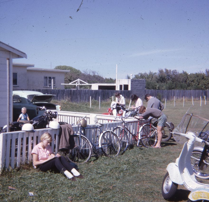 Students sitting outside the hut belonging to the Palmerston North Motorcycle Training School. They are studying the road rules and theory questions which are part of the course. The bicycles leaning against the fence attest to the fact not all students need their own motorcycle. The school has machines to loan to enable students to complete the course.