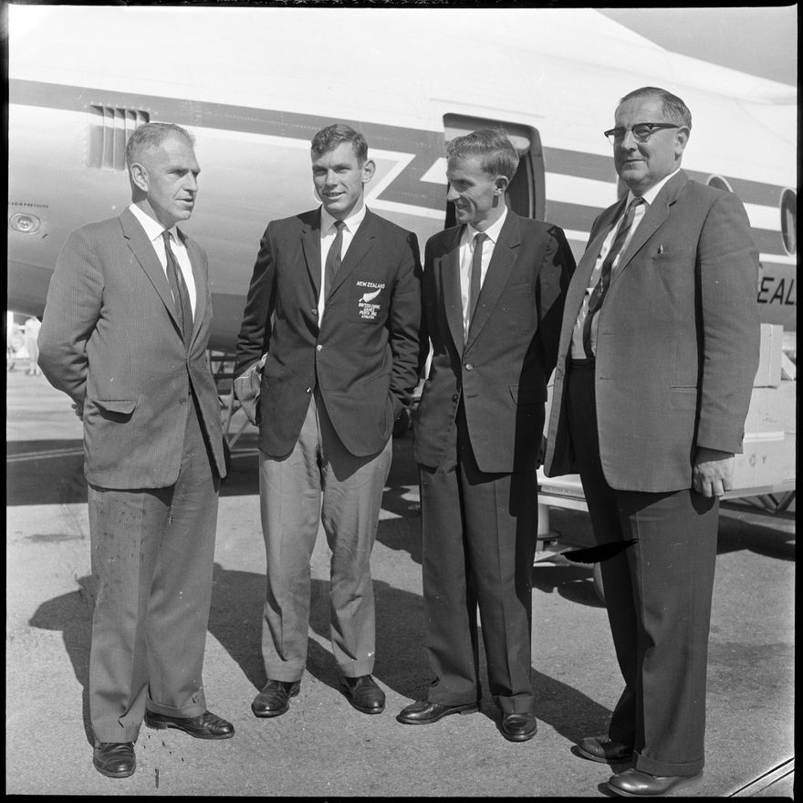 This image was taken for a story that ran in The Manawatu Evening Standard on 06 April 1963, "World-renowned New Zealand athletes Murray Halberg and Peter Snell arrived at the Palmerston North Airport from Auckland this morning en route to Tararua College, where they will compete against relay teams drawn from Wairarapa colleges at a gala day to raise funds for a Tararua College gymnasium. Both men have relations in Eketahuna (Halberg was born there), but they will be staying at an hotel tonight before leaving for Auckland tomorrow. Tonight they will speak at a youth meeting in Pahiatua. In the photograph (from the left) are Mr. I. R. McLean (principal, Tararua College), Peter Snell, Murray Halberg and Mr. W. A. Carthew (chairman of the college's management committee)."