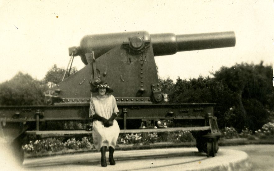 Myra Millicent Freeman sitting next to one of the ornamental cannons in The Square, Palmerston North. Myra (nee Silvester) was the wife of Edward (Ted) Freeman. They married in 1928.