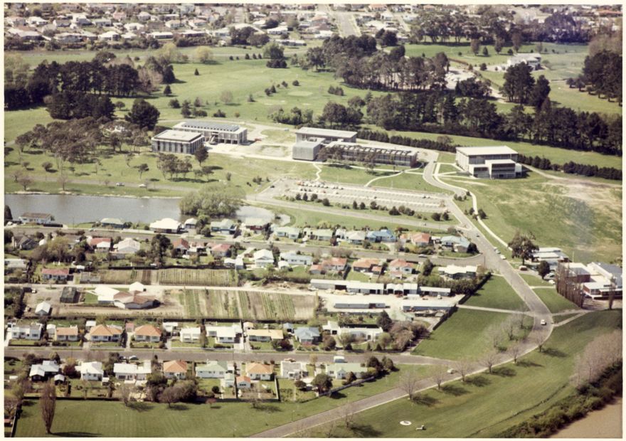 The Palmerston North Teachers' College was constructed in the 1960s. The Manawatu Golf Club is in the background.