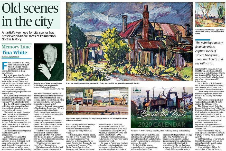Journalist Tina White's weekly "Memory Lane" article in the Manawatū Standard. Publication of the Palmerston North Heritage Trust 2020 calendar, featuring paintings from around Palmerston North in the 1940s, by John Hamilton Tetley.