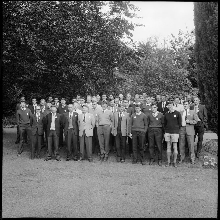 This image was taken for a story that ran in The Manawatu Evening Standard on 1st December 1965 "This smiling group of young men advise thousands of progressive farmers on how to get the best from their land. Farm advisers from all parts of New Zealand - and Chile - they are gathered at Massey University for a four-day course. They have already heard lectures from Farm Improvement Club officers, and are dividing into three groups to concentrate on sheep, dairy and mixed farming problems, said chairman of the conference, Mr. Ian Eva, of the Manawatu Farm Improvement Club: "Our study is of general aspects of farm improvement work, with special consideration of the land-labour-capital relationship, allied with farmers' needs." The five Chileans attending the conference are also farm advisers in their own country, Mr. Pancho Aquirre explained their work as "farm advisers combined with State Advances representatives. We recommend loans from Government and other sources and check on the application of loan money from the World Bank."