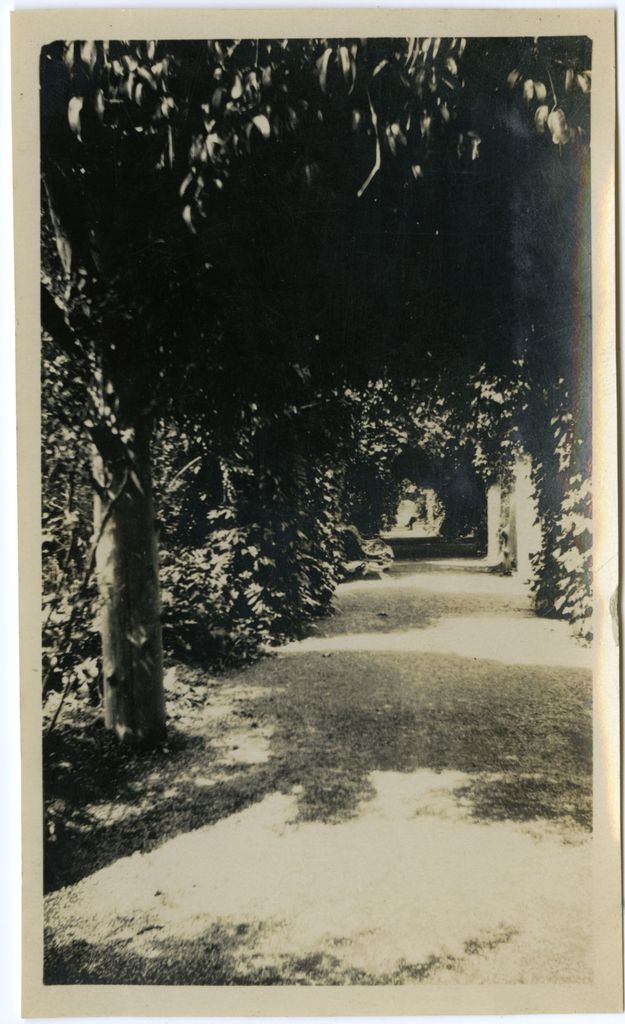 This photograph came from a small photograph album that belonged to Mrs R Andrews of Rangitikei House. This photograph bears the caption, "Lover's Lane, Esplanade PN." This photograph depicts the pergola in the Victoria Esplanade, which was built c 1916-1917 and demolished c 1940.