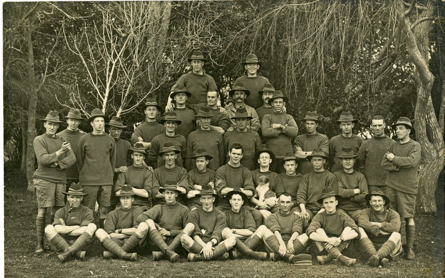 A group of about 35 soldiers pose with a dog. Thought to have been taken at the Awapuni Military Camp. Awapuni Racecourse was home to one of New Zealand’s largest training camps in World War One, and was the sole location for training the New Zealand Medical Corps. staff.