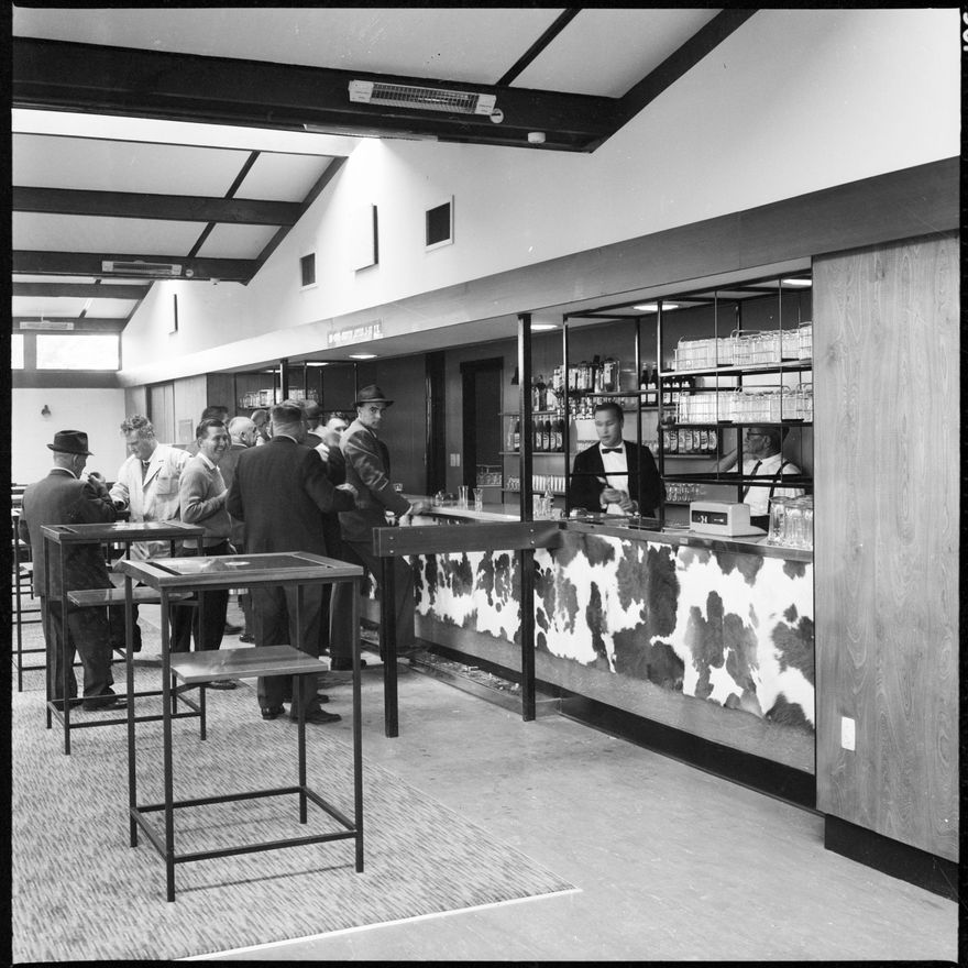 This image was taken for a story that ran in The Manawatu Evening Standard on 3rd December 1965 "Leaner tables and ample seating have been provided in the public bar of the new Awapuni Hotel. Attention has been pain in the decor of the bar, including brown and white calf hides facing the bar itself"