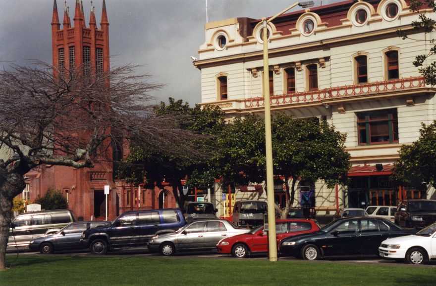 Looking across the green to the corner of Church Street and The Square, where All Saints' Church and The Grand Hotel can be seen, partially obscured by trees.