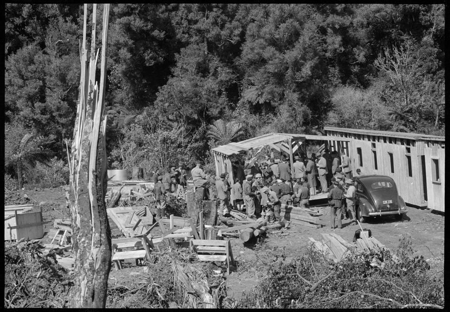 "Turitea dam G. Tremaine turning first sod. Groups with G. Hogg, Engineer and function on site at sod turning."