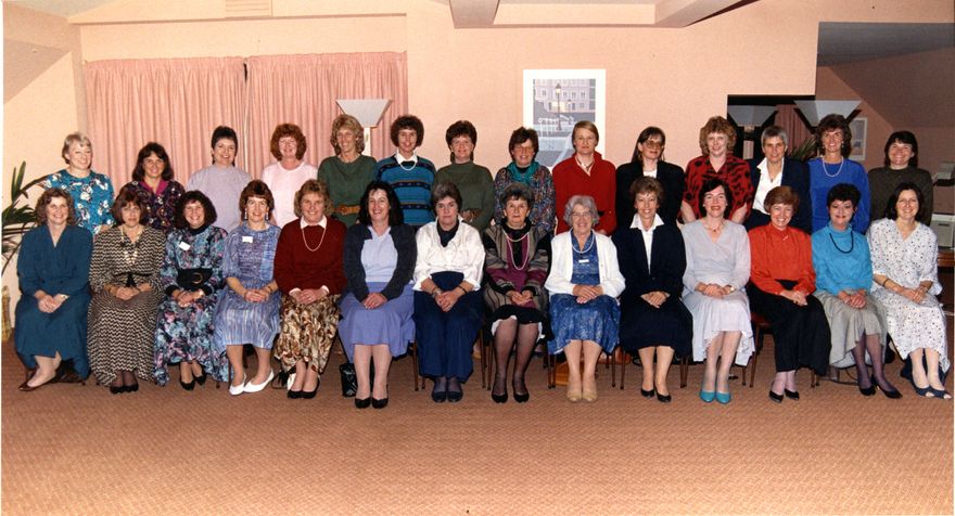 Foundation residents reunion, circa late 1980s-early 1990s. Back Row: Sue Pierce, Robin Buchanan, Alison Kroon, Gail Scully, Pat Dwyer, Anne Honeyfield, Lorraine Gordon, Jocelyn Bleakley, Maxine Mulligan, Donna Burge, Carole Boddie, Sue Colline, Rell Summer, Judith Jenkins Front Row: Carol Larsen, Diane Watts, Margaret Scott, Mary Bennett, June Gilbert, Helen Henare, Raewyn Leighton-Jones, Miss Rikihana, Mrs. Dorothy McConkey, Sharon Bergstrom, Elisabeth Cottam, Jan Ryrie, Joan Gower, Helen Moore.