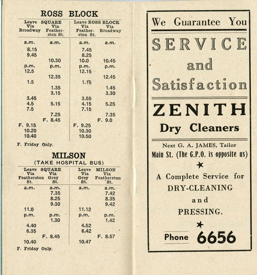 Timetable of the bus, baths and library services provided by the Palmerston North City Council in 1947. Also bus timetable on rural routes provided by Madge Motors.