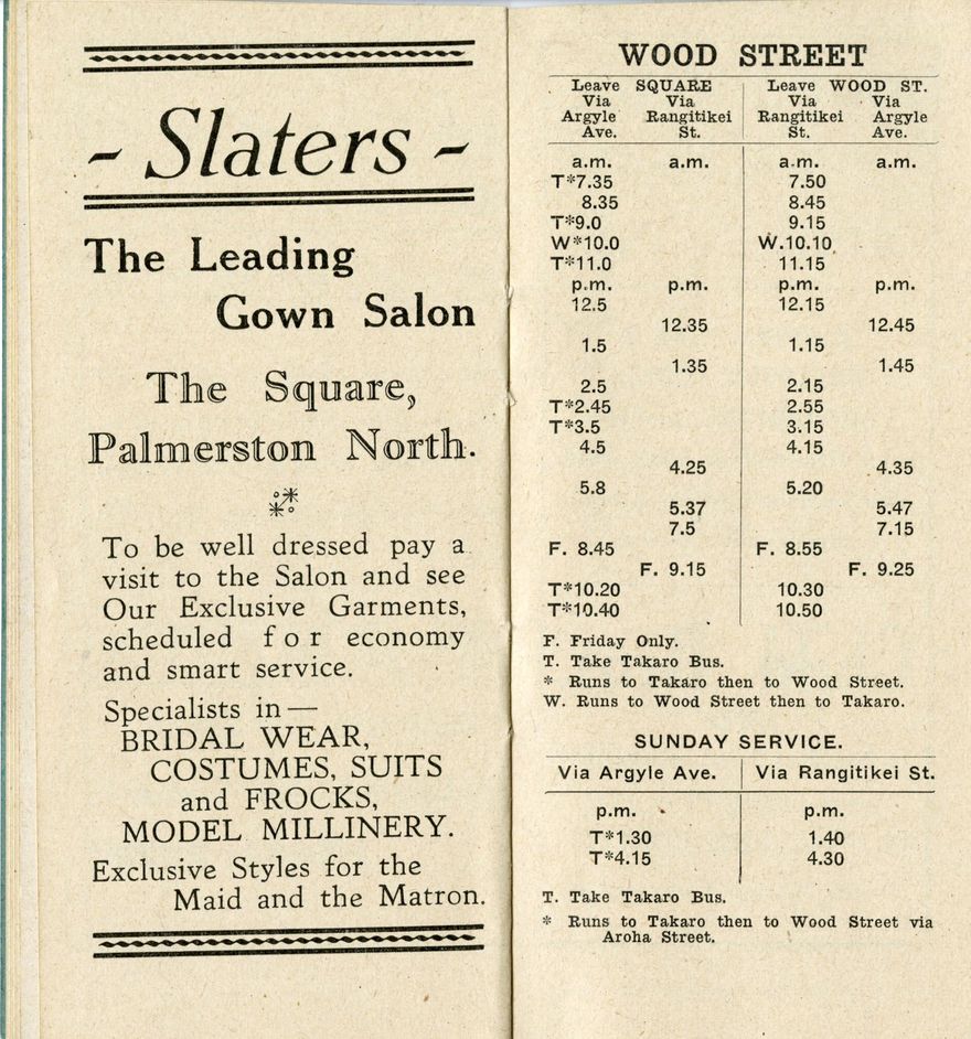 Timetable of the bus, baths and library services provided by the Palmerston North City Council in 1947. Also bus timetable on rural routes provided by Madge Motors.
