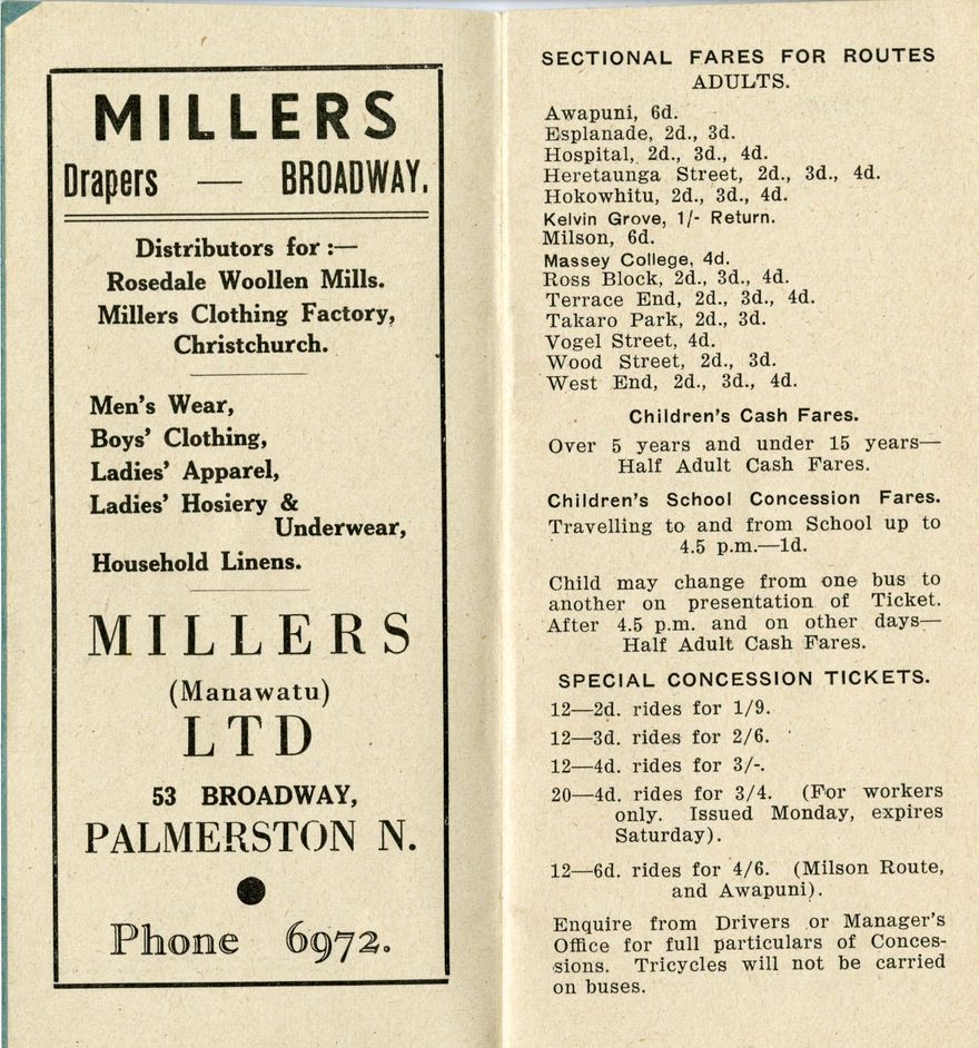 Timetable of the bus, baths and library services provided by the Palmerston North City Council in 1947. Also bus timetable on rural routes provided by Madge Motors.