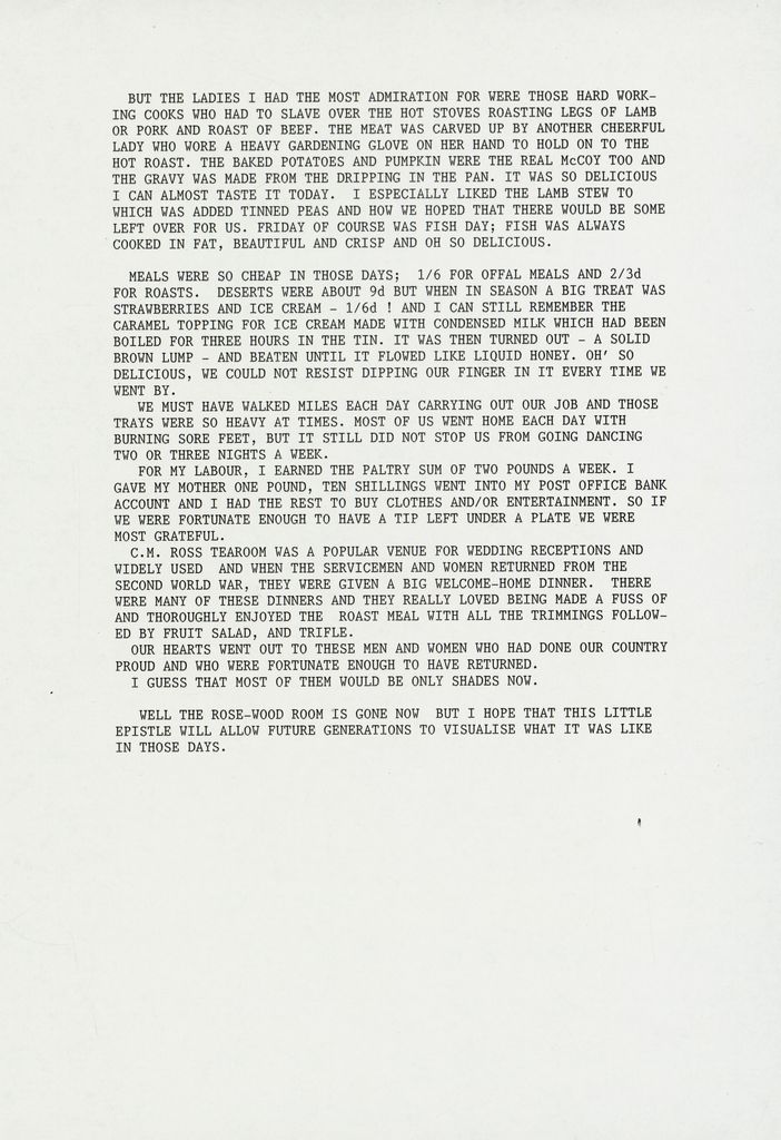 - Four page manuscript written by Corleen Harford, reminiscing about her days working as a waitress in the C M Ross Tearooms as a young woman. The tearooms were on the second floor of the department store overlooking The Square. The C M Ross building is now the Palmerston North City Library.