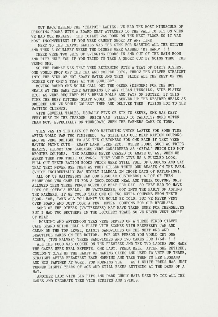 Four page manuscript written by Corleen Harford, reminiscing about her days working as a waitress in the C M Ross Tearooms as a young woman. The tearooms were on the second floor of the department store overlooking The Square. The C M Ross building is now the Palmerston North City Library.