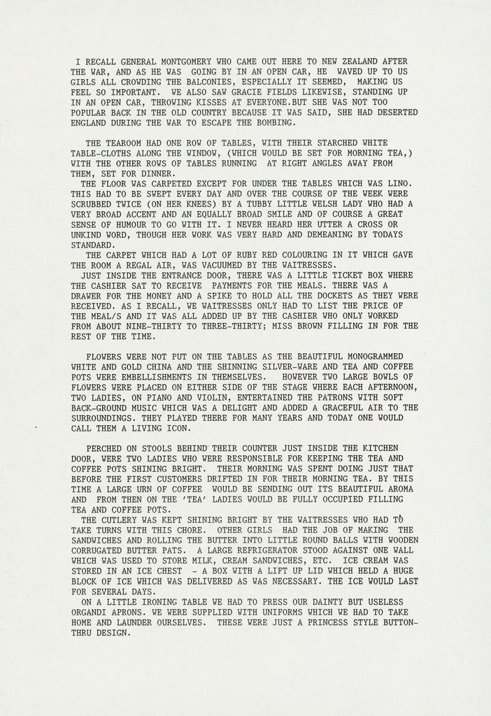 Four page manuscript written by Corleen Harford, reminiscing about her days working as a waitress in the C M Ross Tearooms as a young woman. The tearooms were on the second floor of the department store overlooking The Square. The C M Ross building is now the Palmerston North City Library.