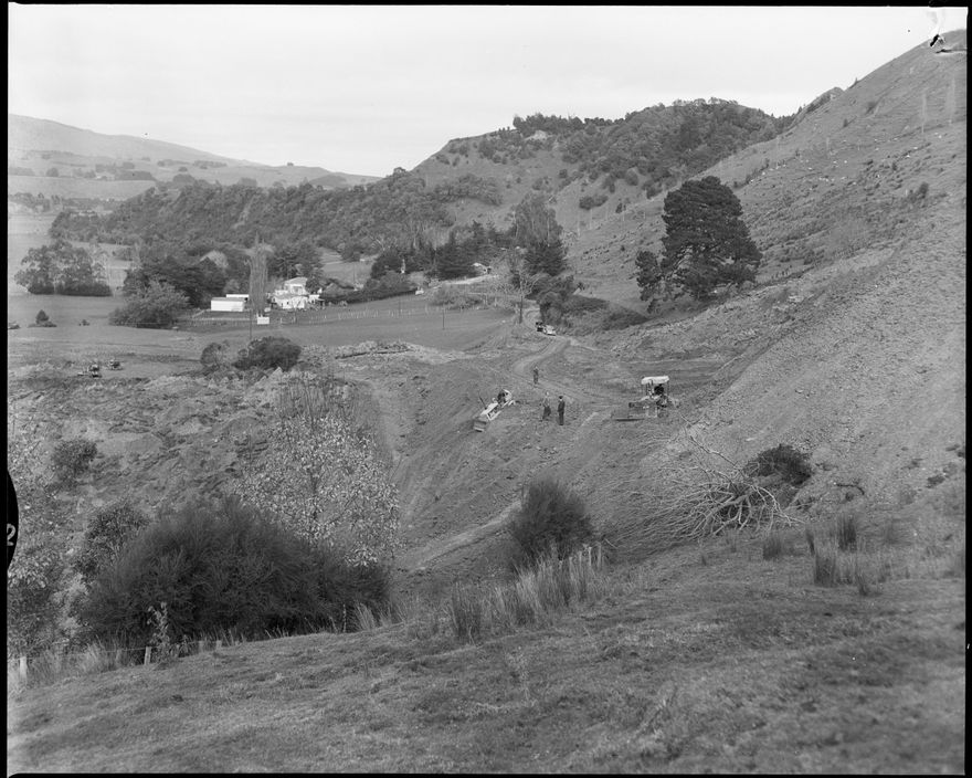 This image was taken for a story that ran in The Manawatu Evening Standard on 8 June, 1959. "This picture of the Pohangina landslide, that covered the Pohangina-Apiti Road last week, was taken this morning. It shows bulldozers at work clearing the slip away. The mail man will be able to go through today for the first time since the slip came down." Other photos associated this article were published.