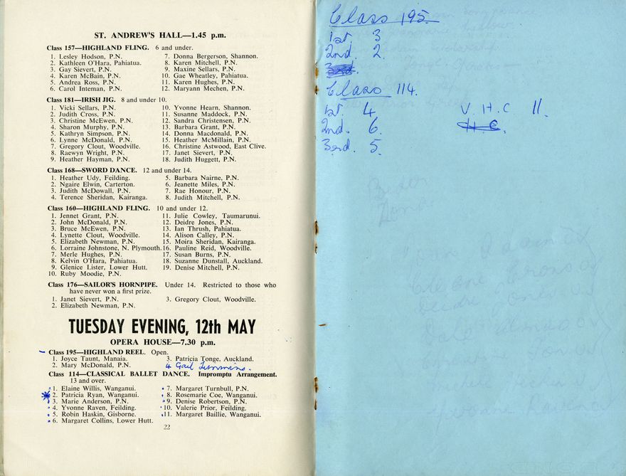 This is the programme for the Thirty-Sixth Annual Festival of the Manawatū Competitions Society, which was held in the Opera House, Concert Chamber and St. Andrew's Hall between 11 and 16 May 1959. The competition categories included speech and drama, dance and music (both vocal and instrumental). Most entrants were children or young people. This programme belonged to Mrs Barr and was bound with additional pages, annotated with notes.