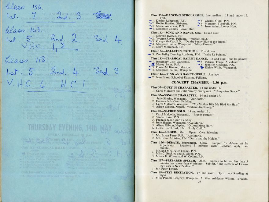 This is the programme for the Thirty-Sixth Annual Festival of the Manawatū Competitions Society, which was held in the Opera House, Concert Chamber and St. Andrew's Hall between 11 and 16 May 1959. The competition categories included speech and drama, dance and music (both vocal and instrumental). Most entrants were children or young people. This programme belonged to Mrs Barr and was bound with additional pages, annotated with notes.