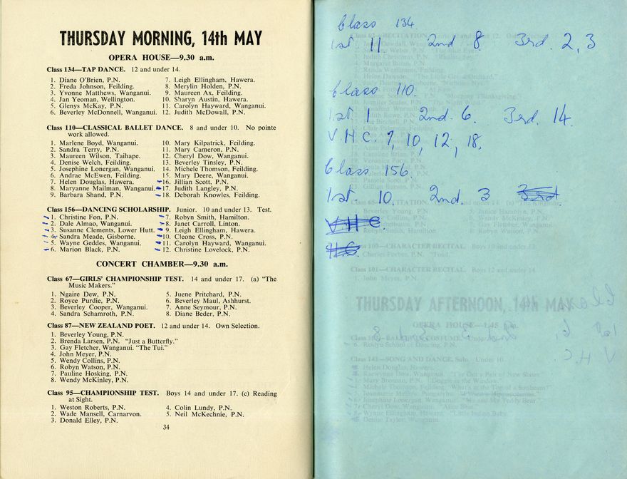 This is the programme for the Thirty-Sixth Annual Festival of the Manawatū Competitions Society, which was held in the Opera House, Concert Chamber and St. Andrew's Hall between 11 and 16 May 1959. The competition categories included speech and drama, dance and music (both vocal and instrumental). Most entrants were children or young people. This programme belonged to Mrs Barr and was bound with additional pages, annotated with notes.