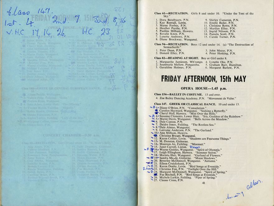 This is the programme for the Thirty-Sixth Annual Festival of the Manawatū Competitions Society, which was held in the Opera House, Concert Chamber and St. Andrew's Hall between 11 and 16 May 1959. The competition categories included speech and drama, dance and music (both vocal and instrumental). Most entrants were children or young people. This programme belonged to Mrs Barr and was bound with additional pages, annotated with notes.