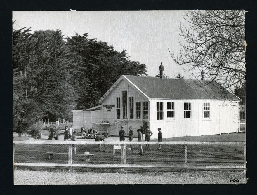 View of the old wooden Aokautere school building with pupils spending recess outside. Aokautere School (formerly known as Fitzherbert East School) was established in 1889.