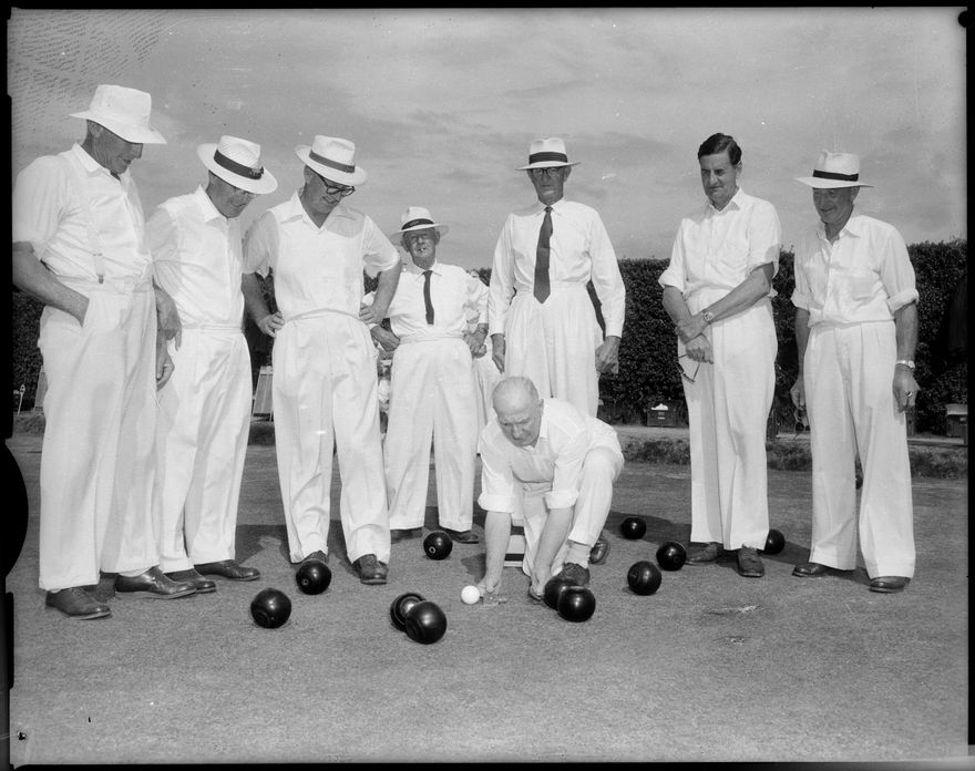 This image was taken for a story that ran in The Manawatu Evening Standard on 13 February 1961: "W. Creed arrives at the true allocation of points for a head as he measures distances of bowls from the jack during the Arnott Shield bowls held during the weekend. The photograph was taken on the Manawatu Club's green. The skips of the two teams competing in the head are standing on the left. They are A. Stevenson and G. Clifford."