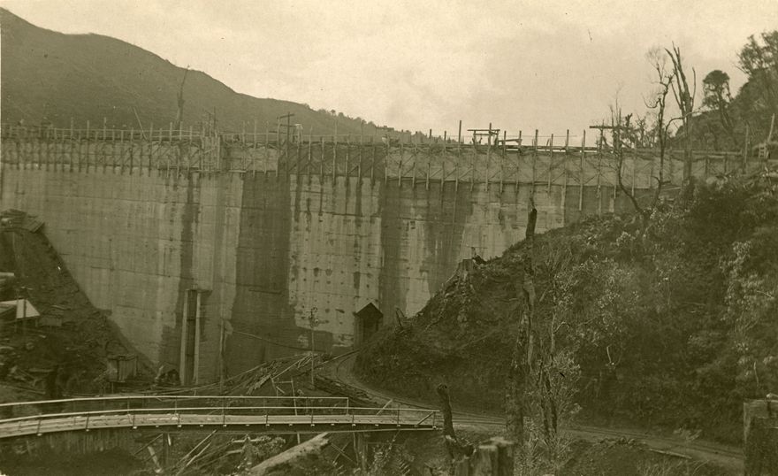 This photograph is part of a collection related to the Mangahao Electric Power Scheme and its construction. The Scheme which provides hydroelectric power, and is situated near the town of Shannon. It serves Wellington, Horowhenua, Taranaki, Hawkes Bay, and the Wairarapa. After being delayed by the first world war construction began in late 1919 and the station opened in November 1924.