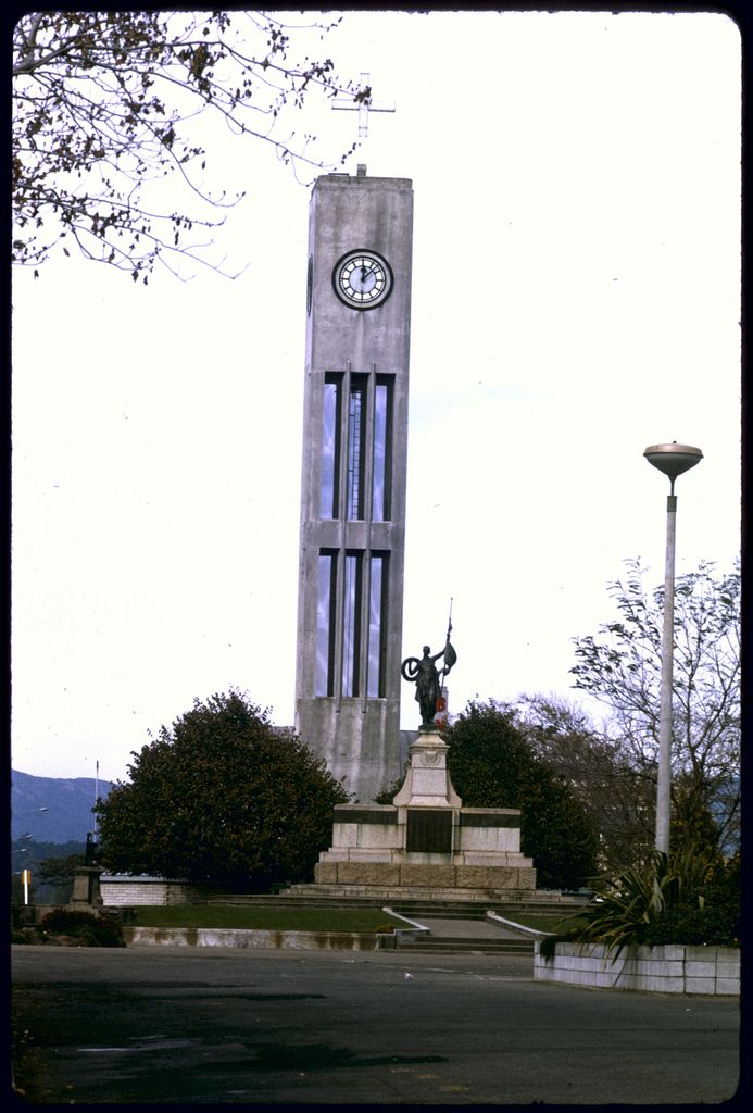 This image of the Hopwood Clock Tower shows it as it was in 1975 before the lantern box was installed. The cross was first erected in December 1960. While intended to be temporary it became a permanent fixture. In 1981 it was replaced with a new more substantial cross, 2.7 metres by 2 metres, paid for by local churches and individuals. The Council paid for its erection and maintenance. The new cross was put in place by crane and was wired by electricians Brian Corsbie, Wayne Bower and David Foster, for lighting from dusk until dawn. A remodeling of the Clock Tower in 2007 saw it replaced by a 'lantern' cross.