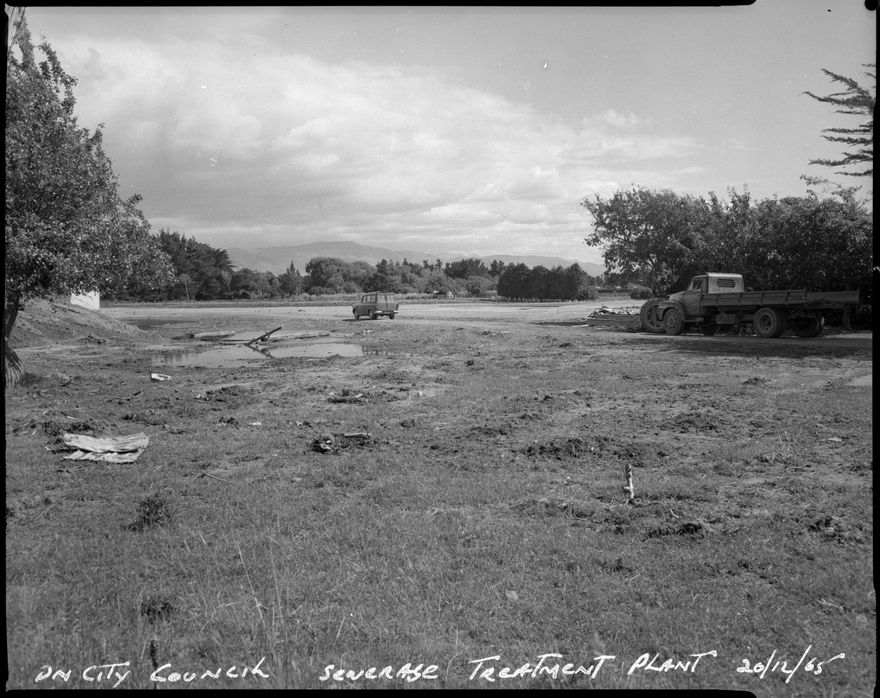 The sewerage treatment plant beside the Manawatu River opened in 1968, replacing the septic tank and filter beds which had been in use since 1905. Some images from this collection have been digitised from prints housed in other archival collections. This image is from an original negative.