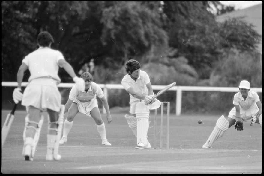 This image was taken (but not used) by the Evening Standard on 21st of January 1982. It depicts the New Zealand women’s cricket team taking on the International XI women’s team in a limited over match for the Hansell's Vita Fresh Women's World Cup 1981/1982. The match was held at Fitzherbert Park in Palmerston North. The New Zealand team won by 97 runs.