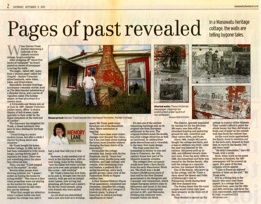 Journalist Tina White's weekly "Memory Lane" article in the Manawatū Standard. When Darren Trask started renovating his country cottage, he found historic newspapers dated 1887 in the wall linings. The cottage, address 1033B Napier Road, is classified as a category II Historic place by the New Zealand Historic Places Trust: "a place of historical or cultural heritage significance or value".