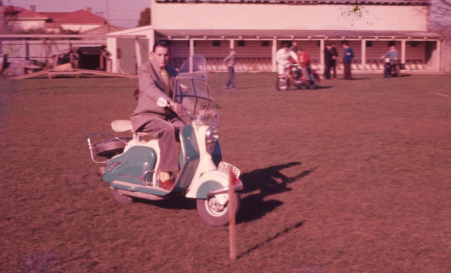 A student manoeuvring around the pegs at the Palmerston North Motorcycle Training School. The Central Normal School can be seen in the background.