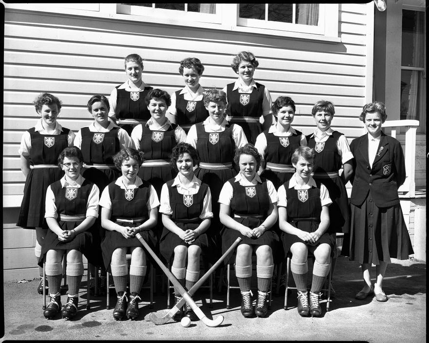 A group of fourteen female students from the Palmerston North Teachers' College pose with hockey sticks accompanied by their coach. This negative comes from the Elmar Collection - a large series of semi-identified and unidentified images from the 1930s-1970s.