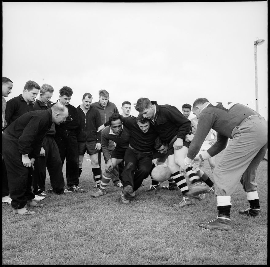 This image was not published in the Manawatu Evening Standard, taken on 26 July, 1963. "Selected Rugby League players from Wellington, Taranaki and the Manawatu are undergoing three days of extensive training in Palmerston North under the eye of Mr C. Mountford, the New Zealand national coach. Mr Mountford, formerly from Greymouth, returned last year from England where he played, coached, and managed teams during the last 16 years." Another image of the group was published on 26 July, 1963.