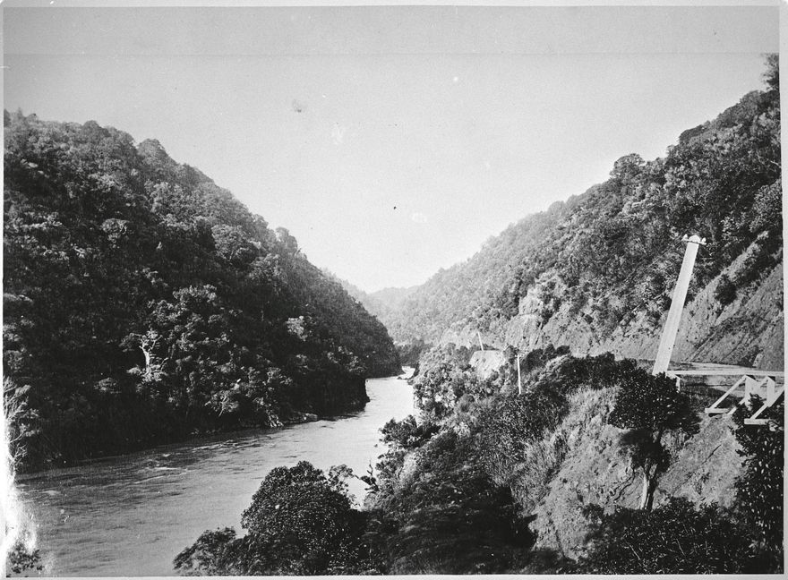 A road was constructed through the Manawatu Gorge in 1871-1872, as seen on the right, with a telegraph line going through 1879-1880. This photograph appears to be taken prior to the railway line being constructed on the opposite bank by 1891.