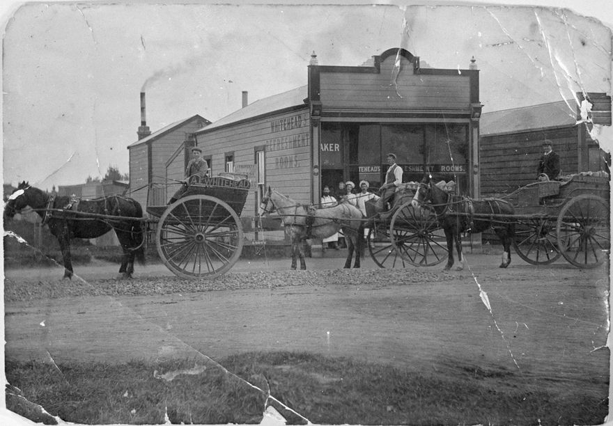 A E Whitehead's bakery was located in Main Street West in 1912. W J (Jack) Foster is one of the drivers seated in the delivery carts.