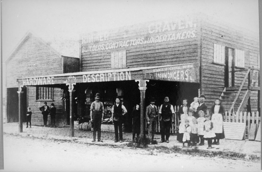 The premises of Rimmer & Craven, Ashhurst, whose services are advertised as "Builders, Contractors & Undertakers" and "Ironmongers." Members of the two families are shown in front of the store. It is thought that the cluster of nine people on the right of the photograph comprise Ellen Rimmer, Tom Rimmer, holding Alick, and Annie at the back with Etta, Lizzie and Alice Craven (order unknown) standing in front of them, and Bob and Reg Craven (or vice versa) at the very front. John Craven stand immediately to the left of Ellen Rimmer. On 23 April 1904, an advertisement appeared in the Manawatu Daily Times announcing that the partnership between Thomas Rimmer and John Craven "storekeepers and timber merchants, at Ashhurst, has been dissolved" and that the business would in future be carried on by John Craven.